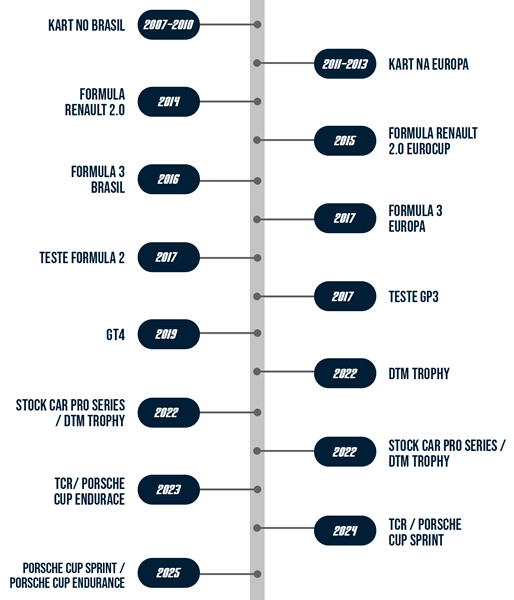 Sua carreira começou no Brasil aos 7 anos no kart, e aos 11 anos foi campeão brasileiro, conquistando o campeonato nacional e vários outros campeonatos regionais. Após 5 anos de carreira no Brasil, mudou-se para a Itália para melhor desenvolvimento, e no Kart Europeu obteve excelentes resultados em eventos mundiais e regionais, tendo como companheiros de disputa: Max Verstappen, Lance Stroll, Charles Leclerc, George Russell, Jack Aitken e Esteban Ocon, que lhe trouxeram boa evolução e formação técnica, e estreando em carros de Fórmula aos 15 anos.